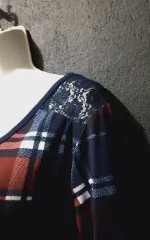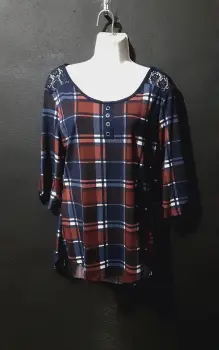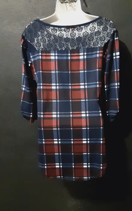 Blusa diseño cuadros vinos y azules y blanco con encaje en los hombros y espalda tela delgada con colá de pato manga mediana