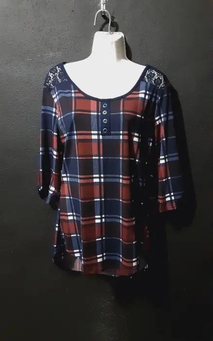 Blusa a cuadros. Blusa diseño cuadros vinos y azules y blanco con encaje en los hombros y espalda tela delgada con colá de pato manga mediana