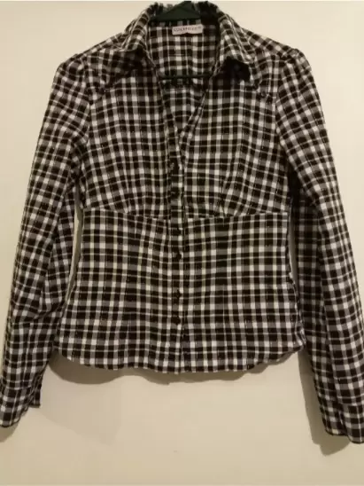 Prenda completamente #excelente estadoBlusa estampado a cuadros, con botones delanteros, manga larga y cuello "V" Tela ligera. Hombro 39 cm Largo 53 cm Largo Manga 62.3 cm Talle o cintura 76 cm Pecho 82 cm Puño 23 cm Composición 51% Algodón 38% Poliéster 1% hilo metal.