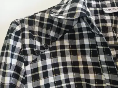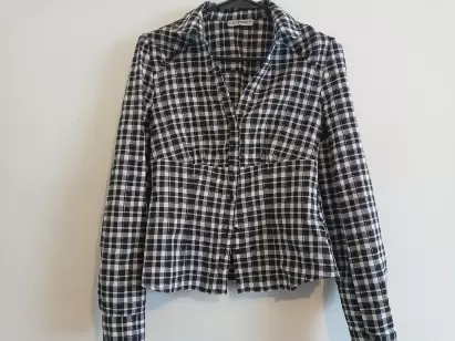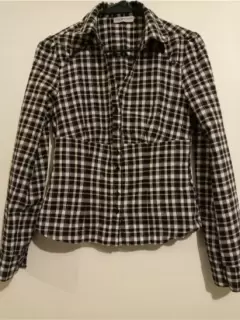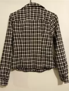 Blusa a cuadros manga larga. Prenda completamente #excelente estadoBlusa estampado a cuadros, con botones delanteros, manga larga y cuello "V" Tela ligera. Hombro 39 cm Largo 53 cm Largo Manga 62.3 cm Talle o cintura 76 cm Pecho 82 cm Puño 23 cm Composición 51% Algodón 38% Poliéster 1% hilo metal.