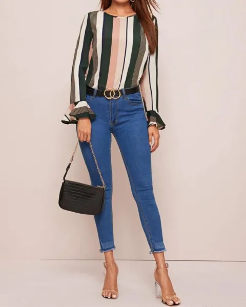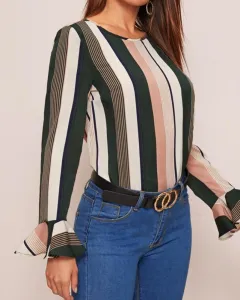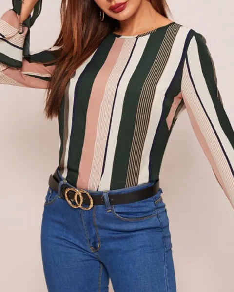 Blusa a rayas en colores verde, rosa claro y blanco, combinación perfecta que harán resaltar tu figura, tiene lindos detalles de ondulados en las mangas y es cuello redondo.