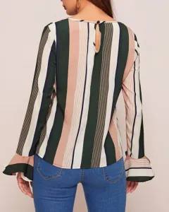 Blusa a rayas con puño holandés. Blusa a rayas en colores verde, rosa claro y blanco, combinación perfecta que harán resaltar tu figura, tiene lindos detalles de ondulados en las mangas y es cuello redondo.