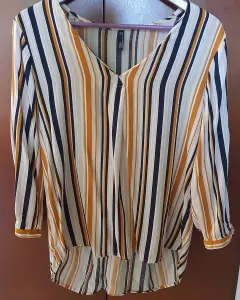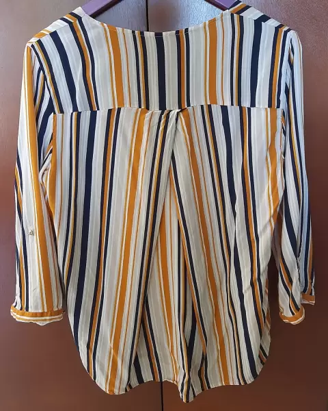 Para un paseo fresco y cómodo por la ciudad 🏙 😉Blusa C&A de rayas en tonos azul, amarillo y blanco. De manga larga, con cintas para arremangarlas y botones. Talle alargado en la espalda.Talla EG, aunque también funciona bien como talla G👌🏼Lavada, planchada y sanitizada 🧼