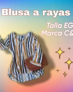 Blusa a rayas talla EG. Para un paseo fresco y cómodo por la ciudad 🏙 😉Blusa C&A de rayas en tonos azul, amarillo y blanco. De manga larga, con cintas para arremangarlas y botones. Talle alargado en la espalda.Talla EG, aunque también funciona bien como talla G👌🏼Lavada, planchada y sanitizada 🧼