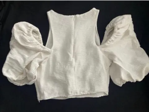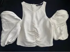 Hermosa blusa color hueso talla Ch, marca Zara en buen estado. Se puede usar de dos formas diferentes con mangas o con hombros descubiertos.