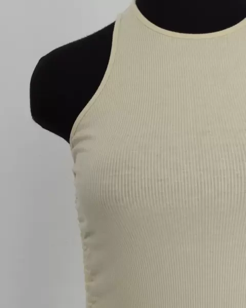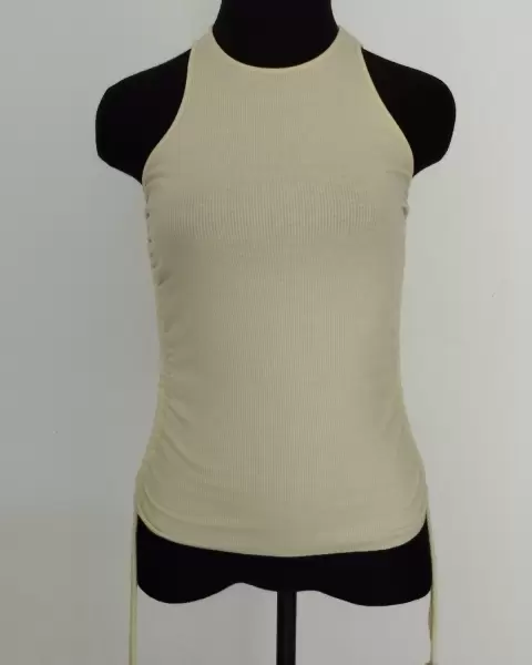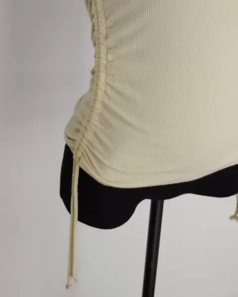 Blusa amarilla con tiras a los lados, tiene un pequeño detalle de un puntito negro