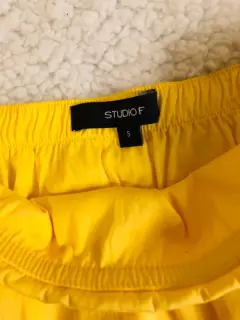 Blusa amarilla neón hombros descubiertos y mangas que se ajustan .Trae plaquita de la marca studio F .
