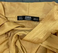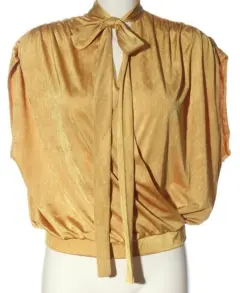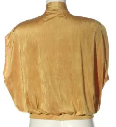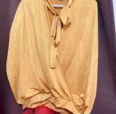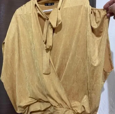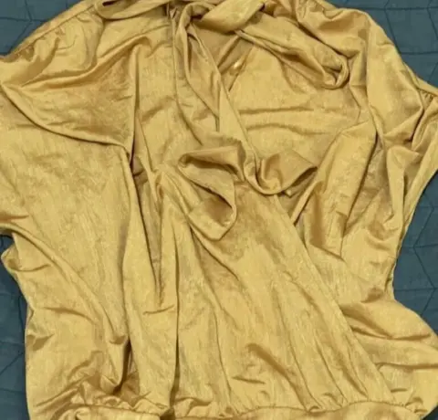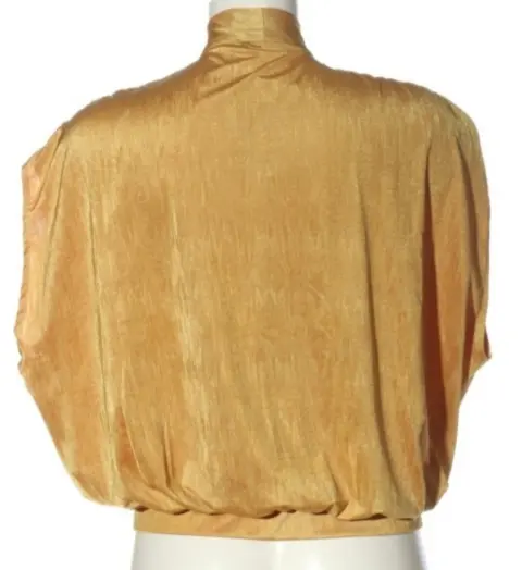 Blusa muy clásica sin manga pero de hombros caídos. Amarillo/oro pálido con lazo al cuello. Linda y diseño muy original! 💛💛💛 SOLO LA USÉ UN RATITO.Talla L, la tela es un poco elástica, no estoy segura de que material es, le corté la etiqueta 🏷 porque me lastimaba, pero recuerdo que alguna vez leí que era poliéster con algo de spandex, es muy suave.
