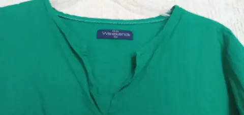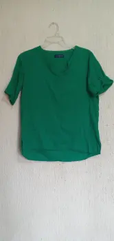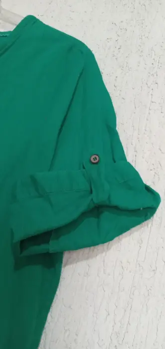 Blusa amplia. En color verde bandera, tela de lino, cuello en V con abertura, 61 cm de largo con abertura a los costados, manga con 1 botón y cinta con ojal para ajustar y modificar el diseño.