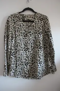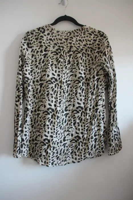 Blusa de manga larga con diseño animal print, los botones son redondos. No tiene detalles, no rota y no manchada. Marca Hollyland, talla G mide 72 cm de largo, 52 cm de axilas, hombro a hombro 40 cm (medidas aproximadas)