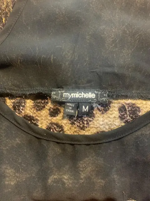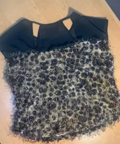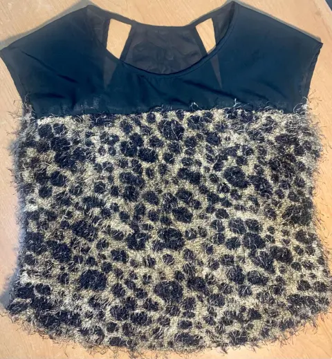 Elegante blusa para dama, en animal print con un toque de transparencia negro. Talla Mediana