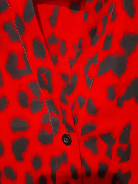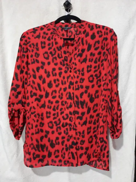 Blusa de poliéster en cuello v animal print roja, manga larga que se puede recoger con botón.