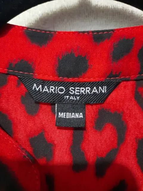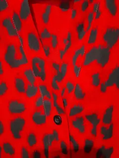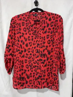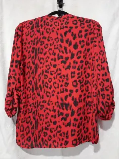 Blusa animal print roja. Blusa de poliéster en cuello v animal print roja, manga larga que se puede recoger con botón.