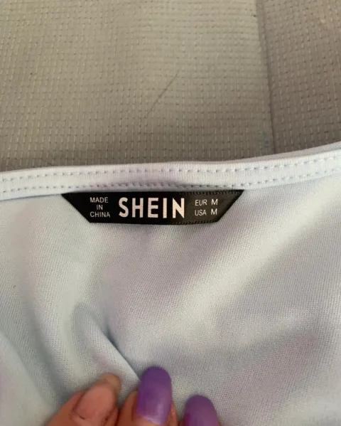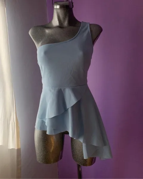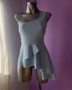 Hermosa blusa asimétrica color azul cielo, talla M. Le va bien a una chica también. Sus medidas son: 43cm de largo, 72cm de cintura, 40cm de axila a axila y 60cm de largo en el lado largo.