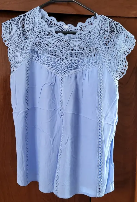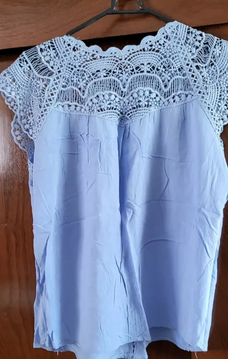 Blusa azul cielo. Blusa azul cielo, manga corta, encaje en los hombros, fresca