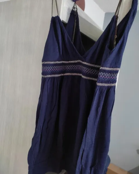 Blusa azul con detalles rosas debajo del busto y tirantes de metal, súper cute