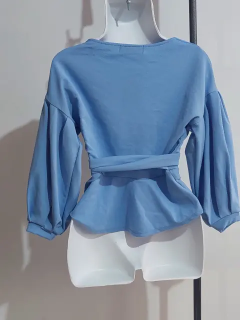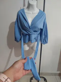 Super linda blusa azul de manga larga y escote en V profundo, tiene los cordones para estilizar y amarrar a la medida de la persona. Super linda, fresca e ideal para vestimenta casual o formal