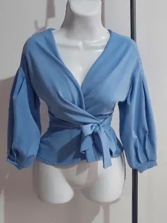 Blusa azul de mangas abollanadas. Super linda blusa azul de manga larga y escote en V profundo, tiene los cordones para estilizar y amarrar a la medida de la persona. Super linda, fresca e ideal para vestimenta casual o formal