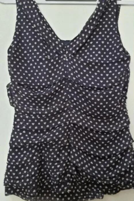 Top Express azul marino.El estampado es de corazones y lunares.Tiene drapeado en la parte de enfrente.Cierre al lado y escote en V en la espalda.Viene forrada por dentroTalla M. Medidas aproximadas: 42cm de axila a axila,42cm de largo a partir de axila.*TODAS MIS PRENDAS SE DESINFECTAN CON LYSOLLAVANDERIA PARA TU MAYOR TRANQUILIDAD*