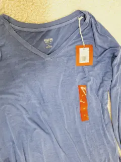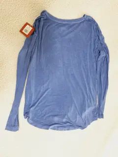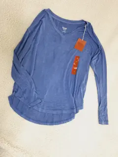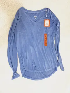 BLUSA AZUL LIGERA MOSSIMO, cuello V, manga larga, ligeramente más larga de atrás, tela fresca y suave, talla XS, pero queda a S o tal vez a M.MedidasDe axila a axila 52cmLargo de frente 63cmLargo de atrás 66cm