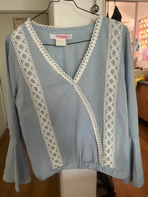 Blusa azul manga ancha cklass. Blusa azul manga ancha cklass con encaje blanco en medio , resorte en la parte de abajo y manga ancha