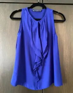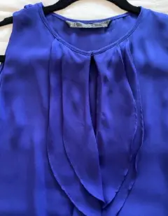 Blusa azul olanes Zara. Súper bonita y vestidora blusa sin mangas con olanes y abertura enfrente! Marca Zara. Solo puesta una vez, esta perfecta!!!