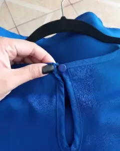 Blusa azul rey es más larga de atrás un poco, cuenta con abertur en la espalda alta zona abajo de cuello y un boton. En la mangas cuenta con botones simulando recogido en las mismas son adorno. Talla 38. Si te interesa algo más te mejoro precio.