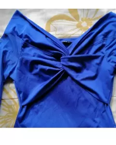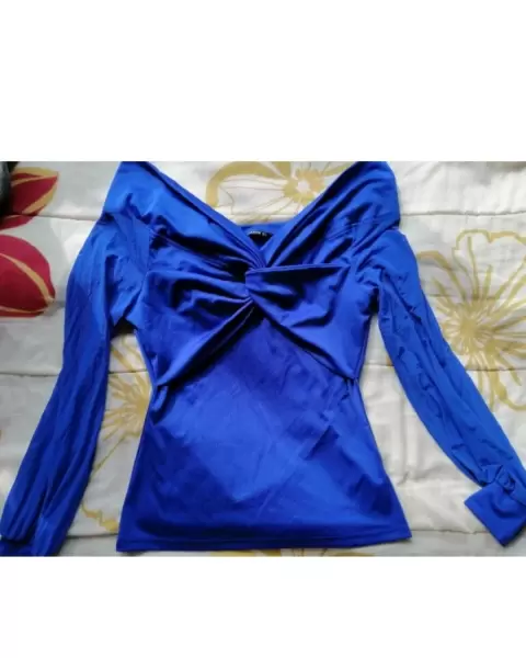 Blusa azul rey, de licra a hombros. Preciosa blusa de cuello cruzado la puedes acomodar a los hombros o llevarla normal, las mangas son tela transparente es de licra estira y amolda muy bonito al cuerpo luce muy sexy ideal para chicas con mucho busto, lo puedes convinar con pantalón blanco, rsaltara tu look, esta completamente nueva