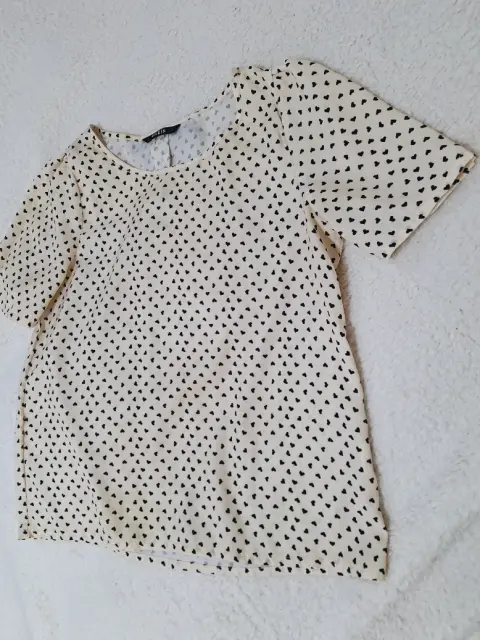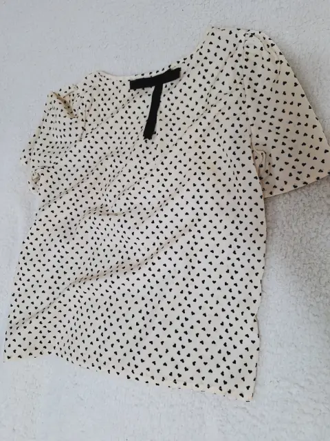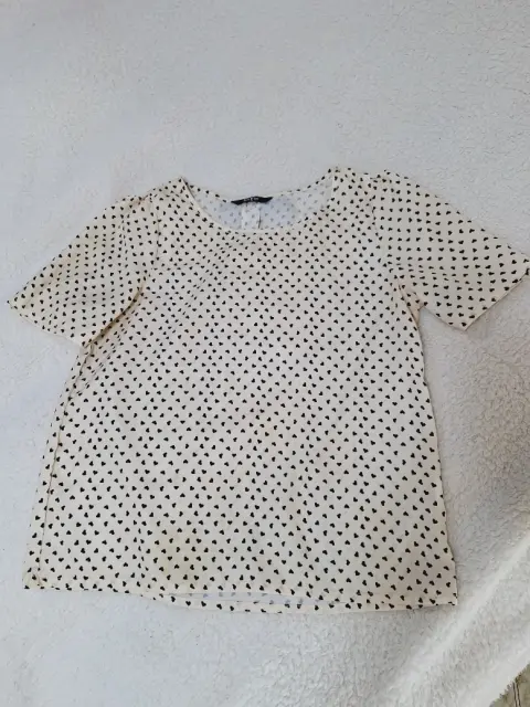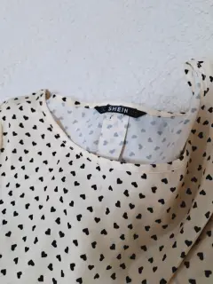 BLUSA BEIGE CORAZONES T XS. BLUSA BEIGE CORAZONES T XS, tela ligera, estampado de corazones, talla XS, sin detalles.Medidas:De axila a axila 46cmLargo 55cm