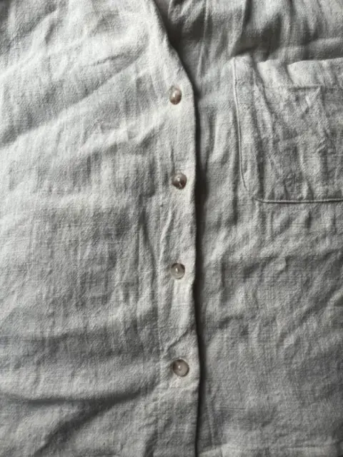 Es talla m , color beige , de largo mide 48cm y ancho 50 cm aprox , la tela es tipo lino