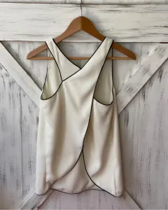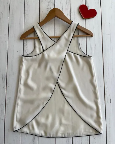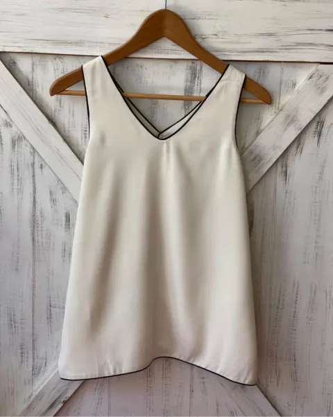 Talla: XSMedidas: 40 cm de axila, el largo medido desde la costura de axila 43 cmBlusa beige con orilla negra es holgada y tiene caída y la espalda está cruzada.