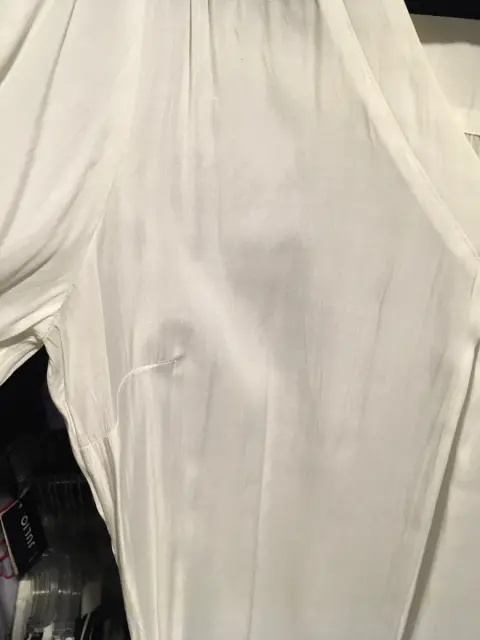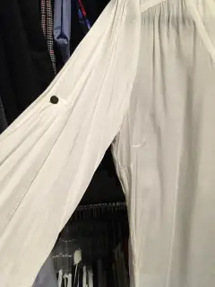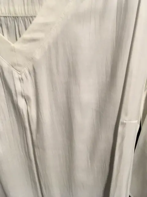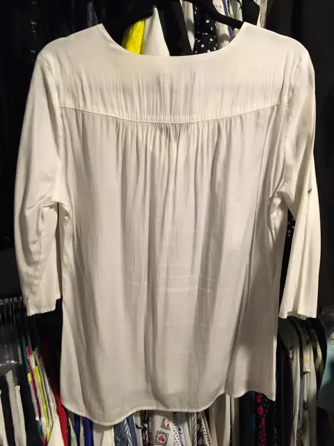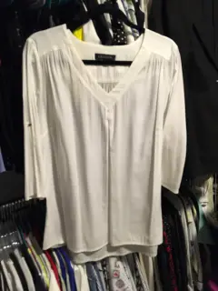 Linda blusa blanca de tela semitransparente tipo seda. Mangas ajustables. Medidas: hombros 41cm, axilas 56cm, cintura 56cm, cadera 59cm, largo 71cm. Talla 34mx. En buen estado y sin detalles.