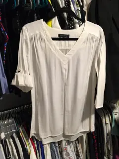 Blusa blanca básica. Linda blusa blanca de tela semitransparente tipo seda. Mangas ajustables. Medidas: hombros 41cm, axilas 56cm, cintura 56cm, cadera 59cm, largo 71cm. Talla 34mx. En buen estado y sin detalles.
