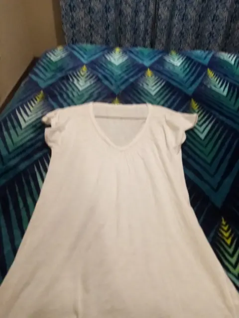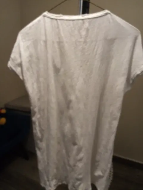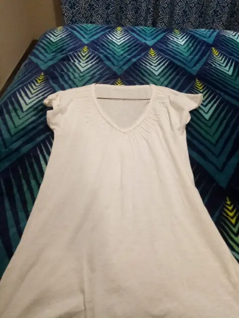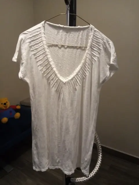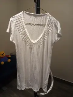 Es blanca cuello V, tiene decoraciones enfrente, lisa por atrás, manfa corta es ligera