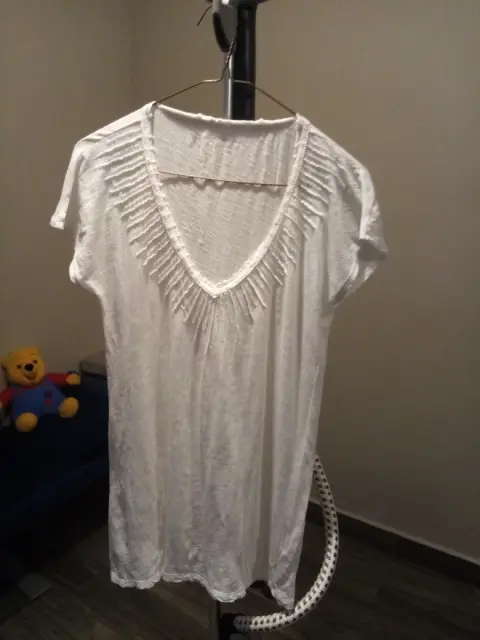 BLUSA BLANCA CALVIN KLEIN. Es blanca cuello V, tiene decoraciones enfrente, lisa por atrás, manfa corta es ligera