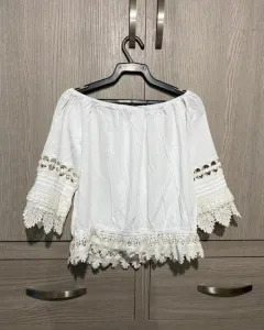 Blusa blanca tipo, campesina, con bordados de frente, sin detalle de uso
