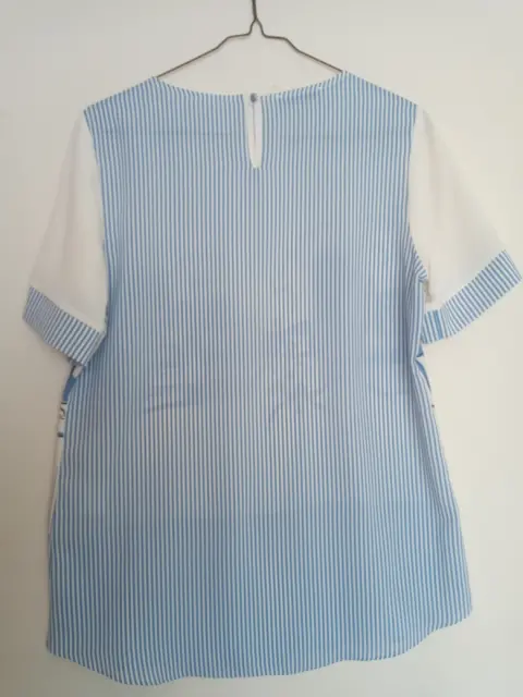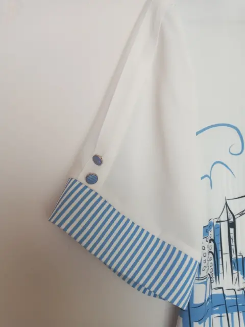 Blusa blanca con azul. Blusa de cuello redondo, enfrente cuenta con un dibujo azul. En las mangas tiene dos botones y una abertura en la parte de la espalda.
