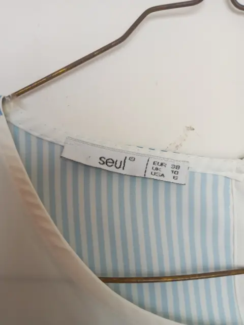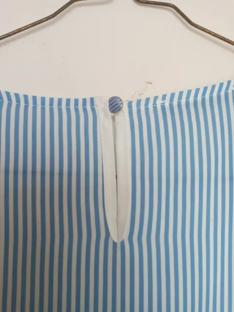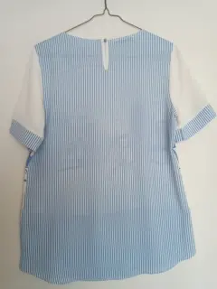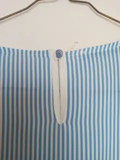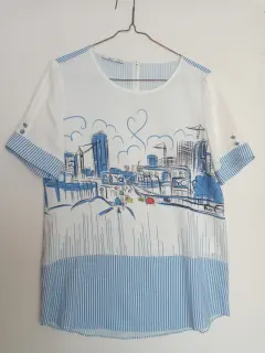 Blusa de cuello redondo, enfrente cuenta con un dibujo azul. En las mangas tiene dos botones y una abertura en la parte de la espalda.