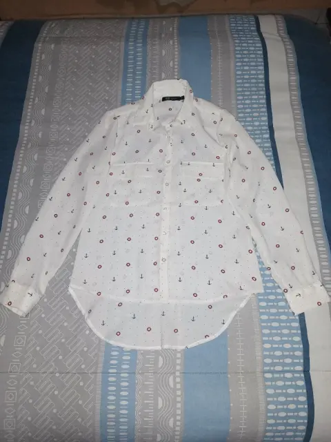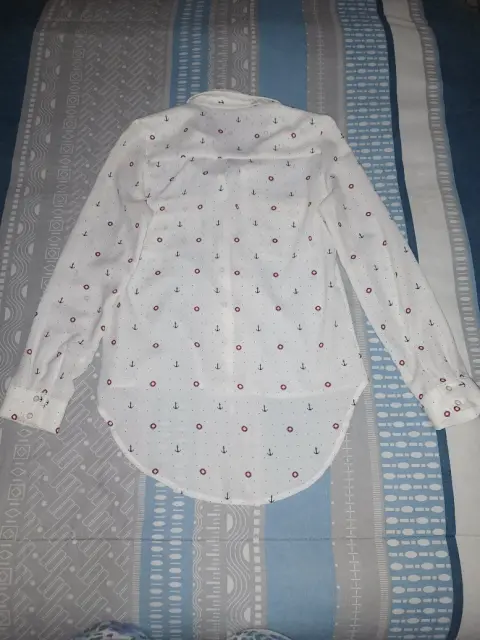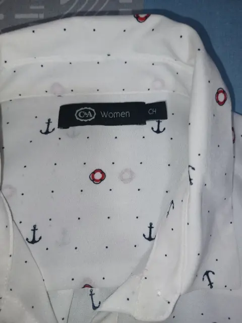 Blusa a botones,color blanco con detalles de anclas, talla S, marca C&E, de uso en perfecto estado