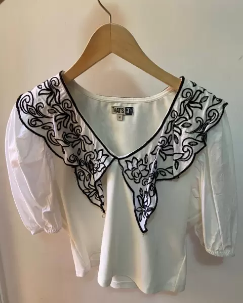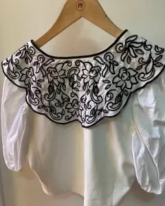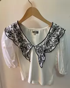 Blusa blanca con detalles en negro. Blusa blanca con detalles en negro y cuello en v. Hombros angostos.Tela muy cómoda, de muy buena calidad.