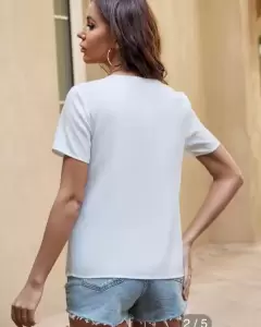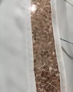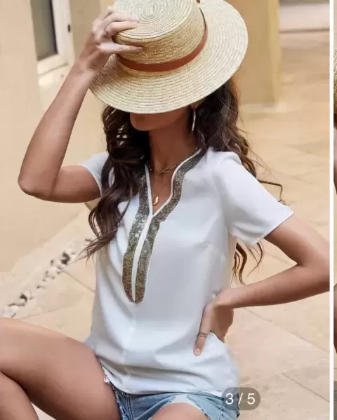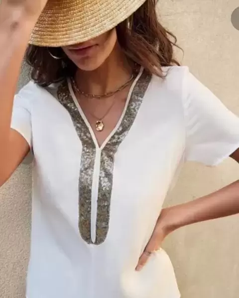Blusa blanca con lentejuela dorada. Hermosa blusa fresca de manga corta,cuello V, con adornos de lentejuela dorada, elegante combina con ropa formal y casualMarca SHEIN talla L Nueva!