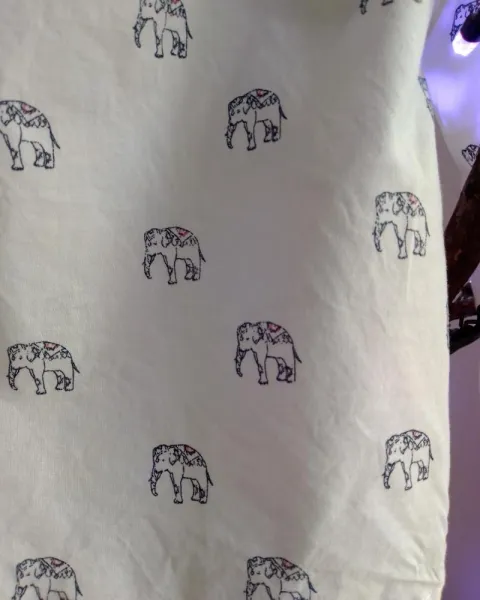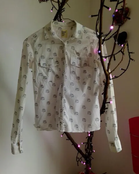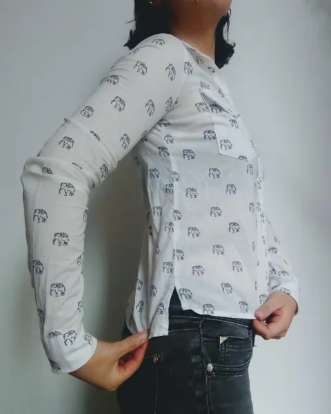 Blusa Blanca Estampado Elefantes. Blusa blanca con estampado de elefantes (atavio de la India), dos pequeños bolsos al frente con botón, botones 100% funcionales.