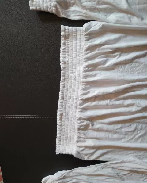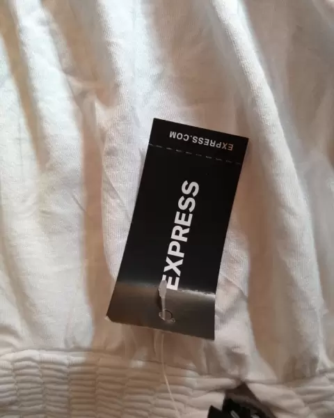 Blusa blanca express. Bonita blusa en color blanco con cuello "V" profundo al igual que en la espalda. Resorte en puños y cintura. Tela ligera y fresca. Nueva con etiqueta y sin detalle