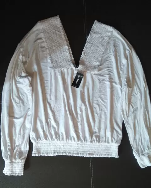 Bonita blusa en color blanco con cuello "V" profundo al igual que en la espalda. Resorte en puños y cintura. Tela ligera y fresca. Nueva con etiqueta y sin detalle