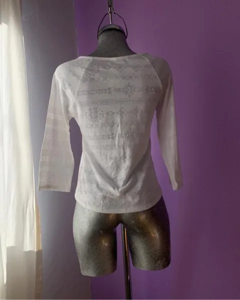 Preciosa blusita, manga 3/4, cuello redondo talla chica. Sus medidas son: 52cm largo, 43cm de axila a axila y 50cm de manga.