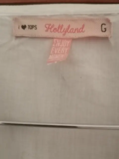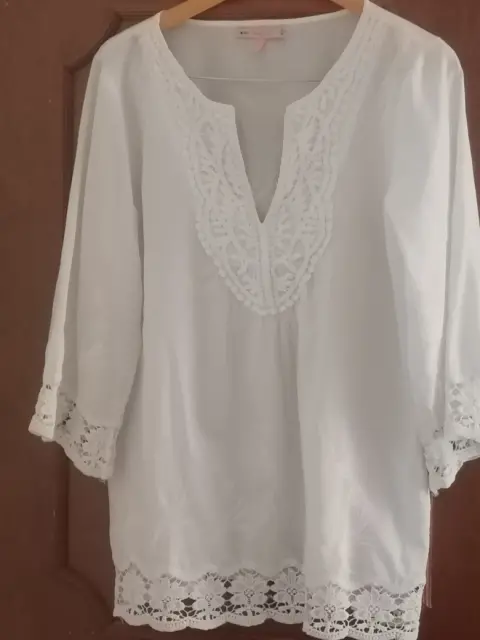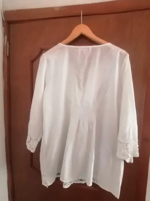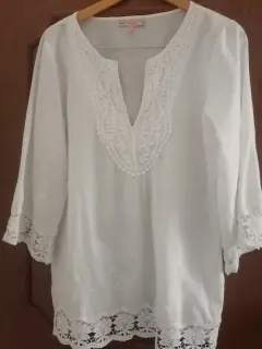 Hermosa blusa blanca cuello V, tipo artesanal en talla G, marca Hollyland, tela delgada y fresca con detalle de aplicación de bordado en escote, mangas y contorno al final de la blusa. Super combinable.