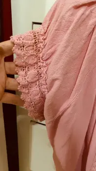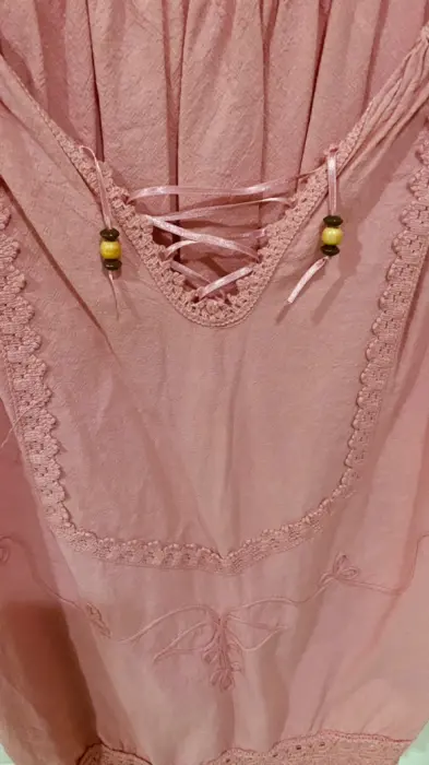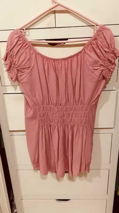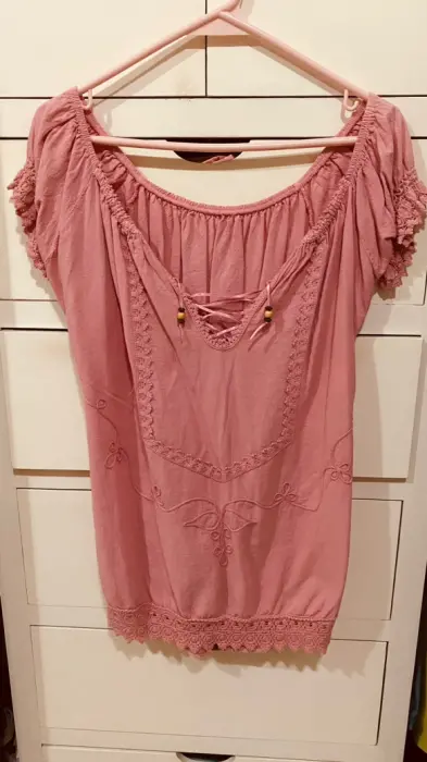 Hermosa blusa-blusón rosa pastel, de tela gruesa, con detalles de olanes, cordón al frente y resorte por detrás para resaltar figura