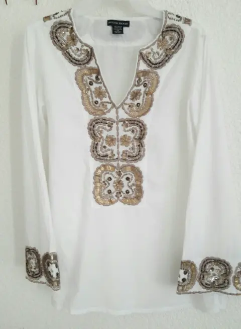 Hermosa blusa bordada en mangas y cuello con detalles en tonos dorados, fresca y Bohemia