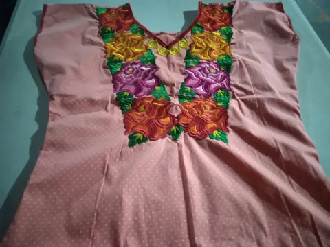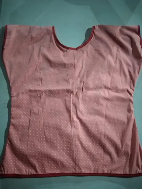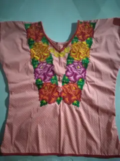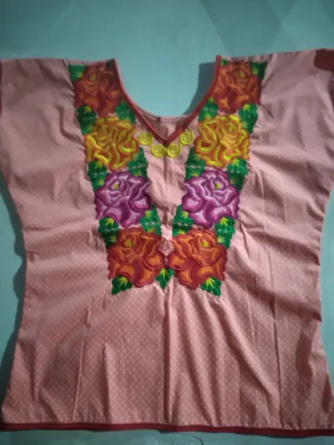 blusa bordada del istmo. Hermosa blusa bordada solo por la parte de enfrente sobre popelina strech color coral con lunares blancos completamente nuevo talla mediana para chicas con busto grande