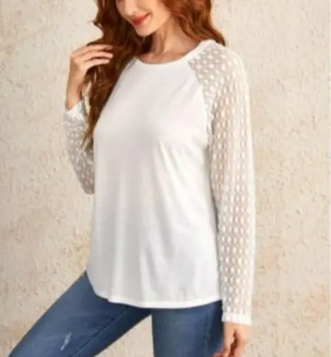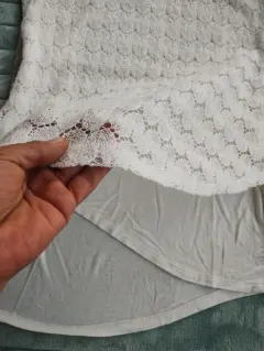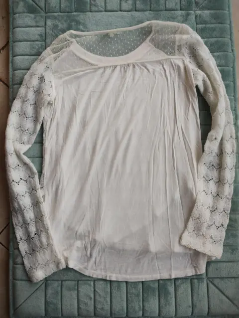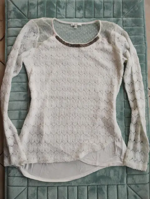 Blusa bordada encaje manga larga. Blusa tipo suéter tejida delgadaCon detalle de transparencia en espalda y brazosLindo detalle en el cuello de chaquiras plateadasFondo ligeroUsada una vez sin detalleTalla S y queda también a MMide 42 cm de hombro50 cm de axila63 cm de largo